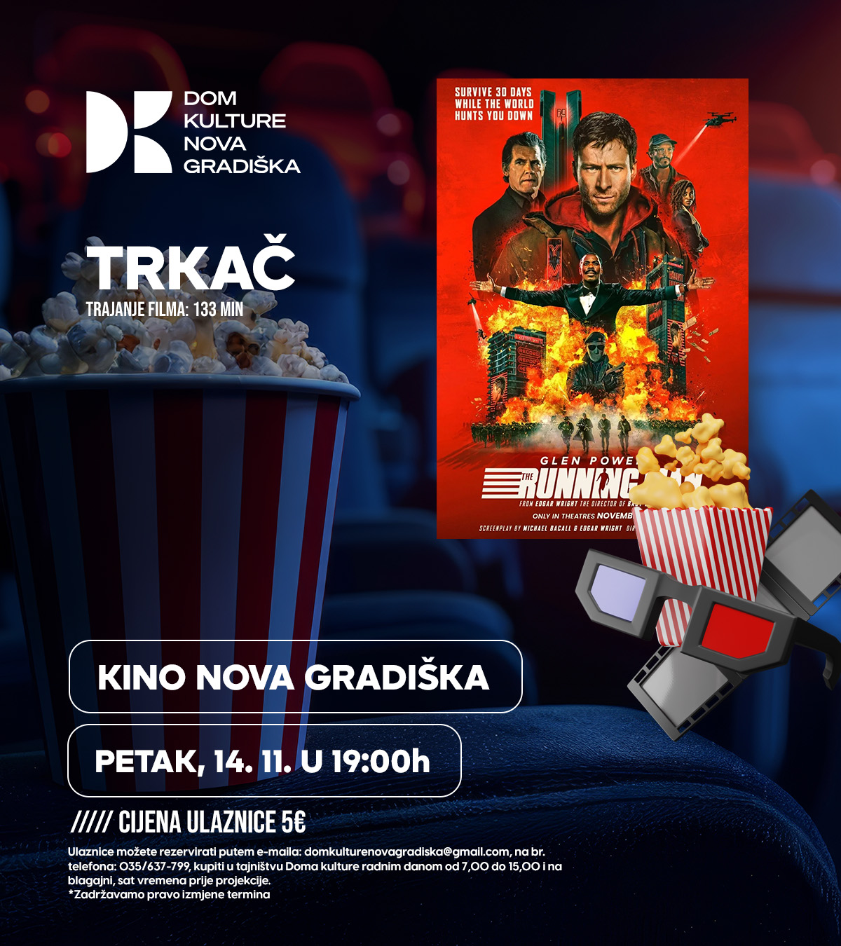 TRKAČ PETAK, 14. 11. U 19:00 IZVORNO IME: The running man REŽIJA: Edgar Wright ULOGE: Glen Powell, William H. Macy, [...]