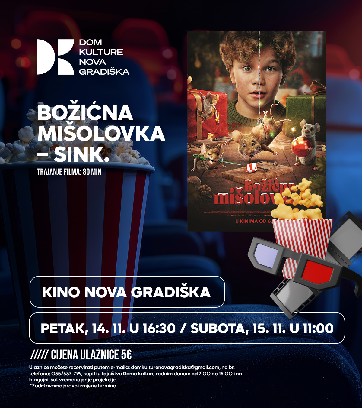 Više...BOŽIĆNA MIŠOLOVKA – SINK. PETAK, 14. 11. U 16:30 SUBOTA, 15. 11. U 11:00 IZVORNO IME: A Mouse Hunt for Christmas REŽIJA: Henrik Martin Dahlsbakken GLASOVI: Davor Kovač, Marko Cindrić, Tihana Fraculj, [...]